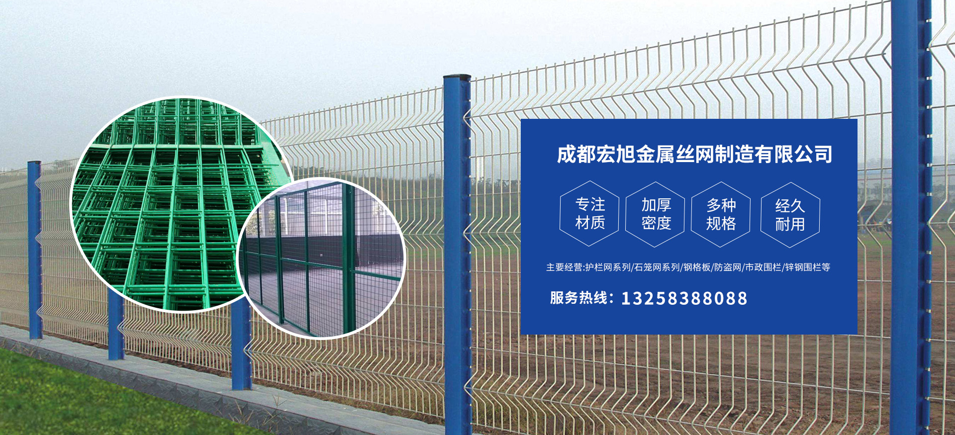 成都宏旭金屬絲網(wǎng)制造有限公司主營護欄網(wǎng)系列、石籠網(wǎng)系列、鋼格板、防盜網(wǎng)、市政圍欄、鋅鋼圍欄、鋼筋網(wǎng)片、聲屏障系列、波形護欄板、柔性纜索護欄、SNS邊坡防護網(wǎng)等其他絲網(wǎng)類產(chǎn)品。特殊規(guī)格可加工定做,也可根據(jù)客戶來圖來樣定做。自創(chuàng)業(yè)以來,公司一直堅持市場為導向,以客戶為根本,以實業(yè)為基礎,以技術為支持,以科研為后盾,集科研、生產(chǎn)、經(jīng)營為一體,不斷研制開發(fā)新產(chǎn)品,開拓市場,走綜合發(fā)展之路。多年來,公司憑借過硬的質量,良好的信譽、優(yōu)質的服務、合理的價格,贏得了市場和商家的一致好評。